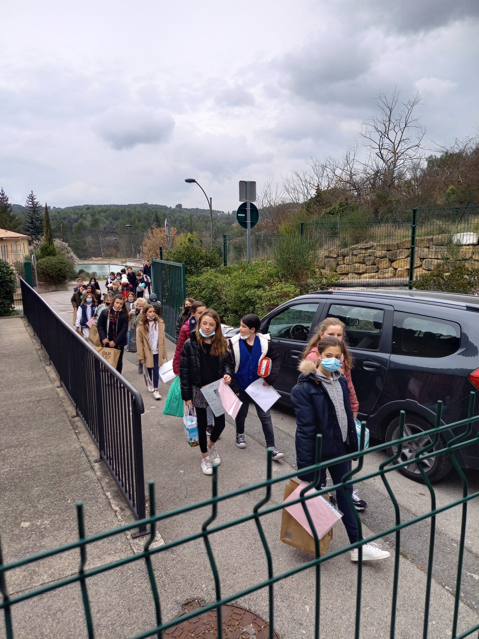 Les élèves de la classe de CM2 en marche pour un temps de sensibilisation à la question de la solidarité envers des populations en guerre et des familles réfugiées.