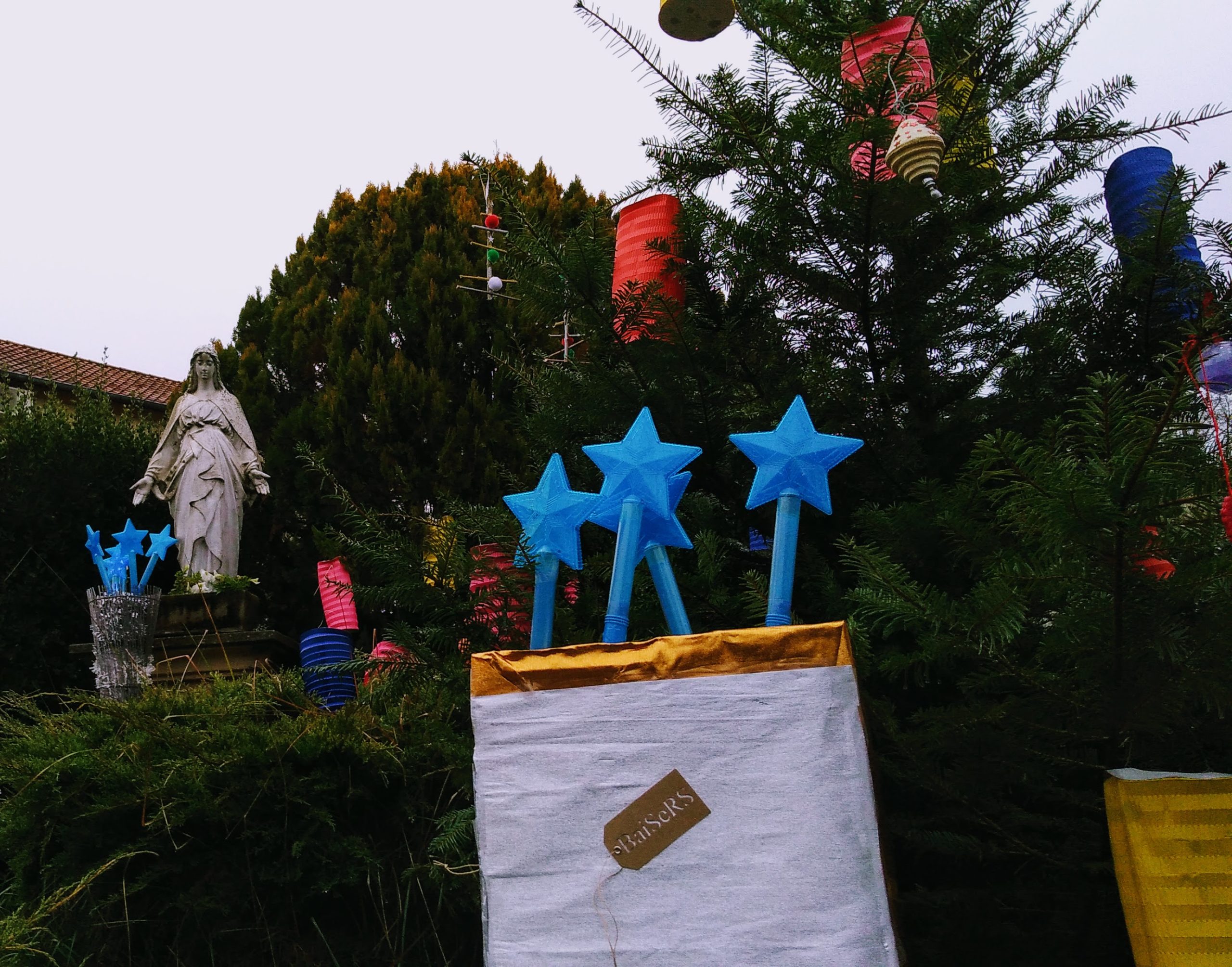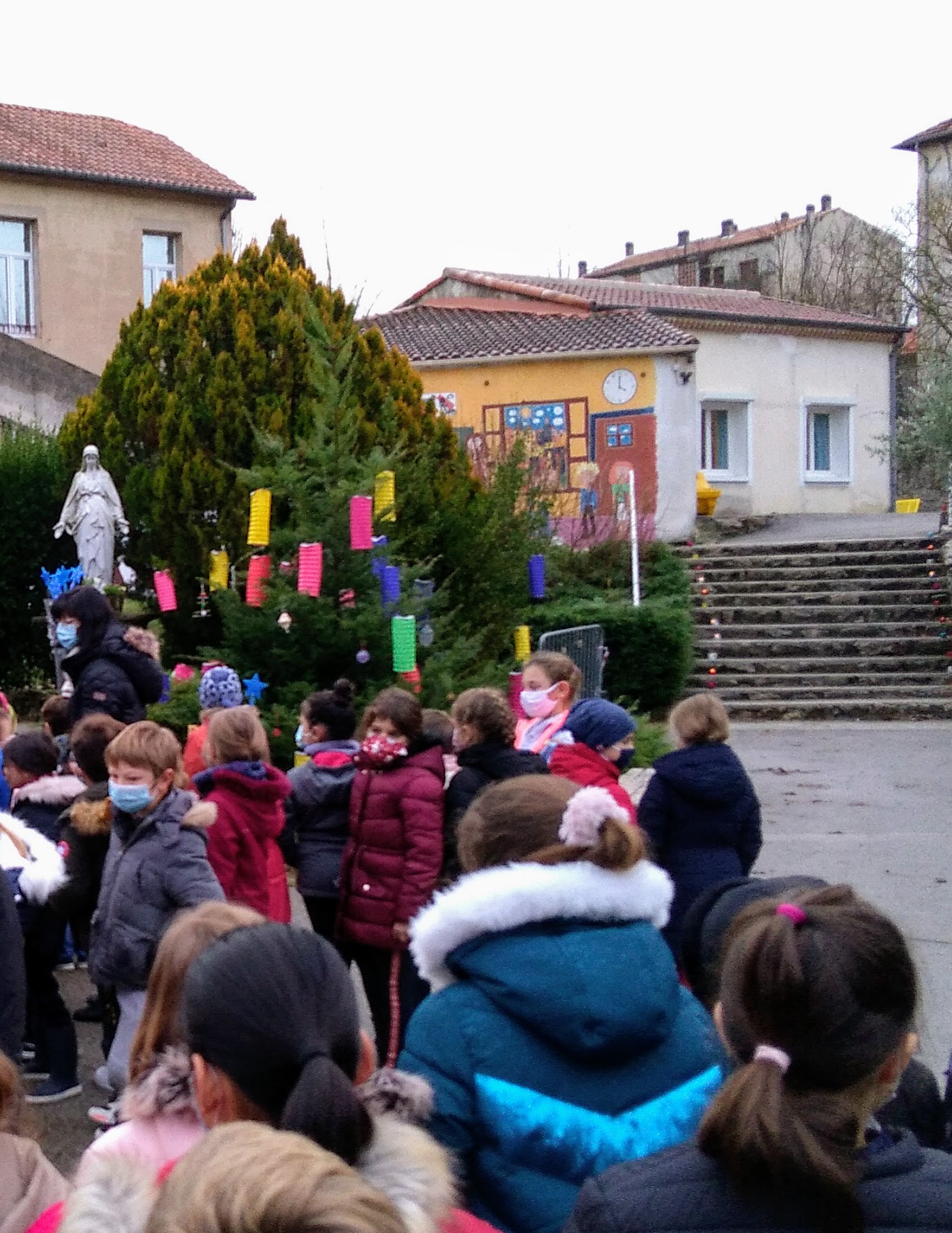 Ecole Sainte Marie Fuveau Marie fête des lumières 8 décembre 2020 tous les enfants sont rassemblés devant le massif où la statue le la vierge Marie d'une hauteur de 3 mètres se dresse autour d'arbustes avec des lanternes éclairés dans les arbres